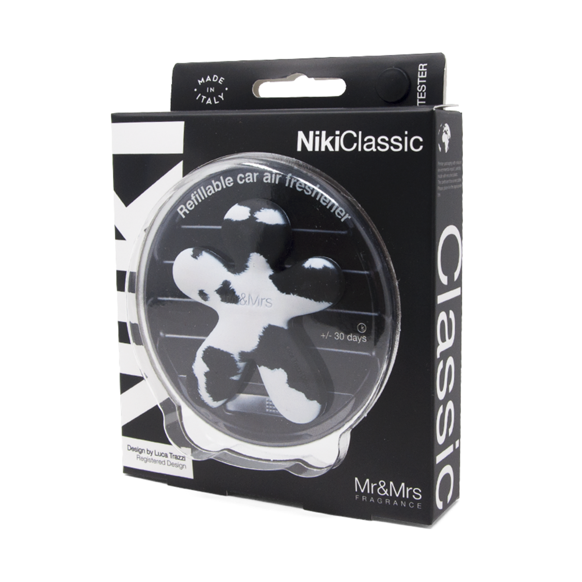 Dišavo Niki vzamete iz pakirane folije in na kromiran (nezamenljiv del) pritrdite EVA polnilo. S pomočjo univerzelne sponke, ki se nahaja na hrbtni strani, lahko dišavo pritrdite zračnik v vsakega avtomobila (tako vertikalno kot horizontalno).