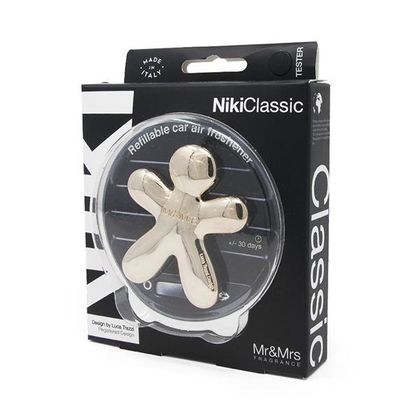 Dišavo Niki vzamete iz pakirane folije in na kromiran (nezamenljiv del) pritrdite EVA polnilo. S pomočjo univerzelne sponke, ki se nahaja na hrbtni strani, lahko dišavo pritrdite zračnik v vsakega avtomobila (tako vertikalno kot horizontalno).