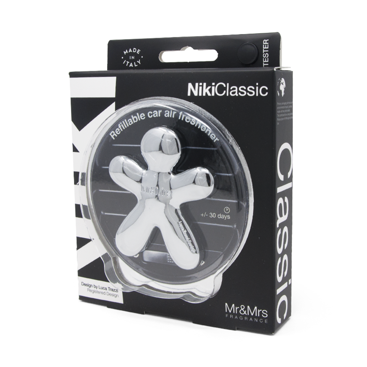 Dišavo Niki vzamete iz pakirane folije in na kromiran (nezamenljiv del) pritrdite EVA polnilo. S pomočjo univerzelne sponke, ki se nahaja na hrbtni strani, lahko dišavo pritrdite zračnik v vsakega avtomobila (tako vertikalno kot horizontalno).