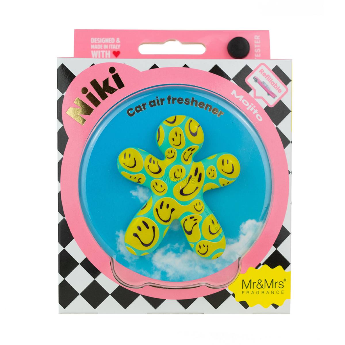 Dišavo Niki vzamete iz pakirane folije in na kromiran (nezamenljiv del) pritrdite EVA polnilo. S pomočjo univerzelne sponke, ki se nahaja na hrbtni strani, lahko dišavo pritrdite zračnik v vsakega avtomobila (tako vertikalno kot horizontalno).