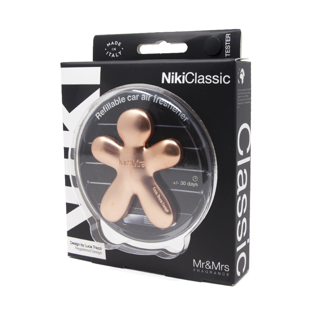 Dišavo Niki vzamete iz pakirane folije in na kromiran (nezamenljiv del) pritrdite EVA polnilo. S pomočjo univerzelne sponke, ki se nahaja na hrbtni strani, lahko dišavo pritrdite zračnik v vsakega avtomobila (tako vertikalno kot horizontalno).