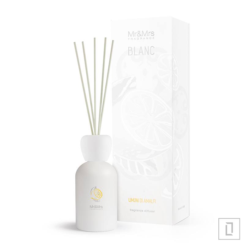 Elegantna bela steklenička prekrita s sijočim lakom in  na dotik nežno belo dekorativno kapico ter dišavo Limoni Di Amalfi.